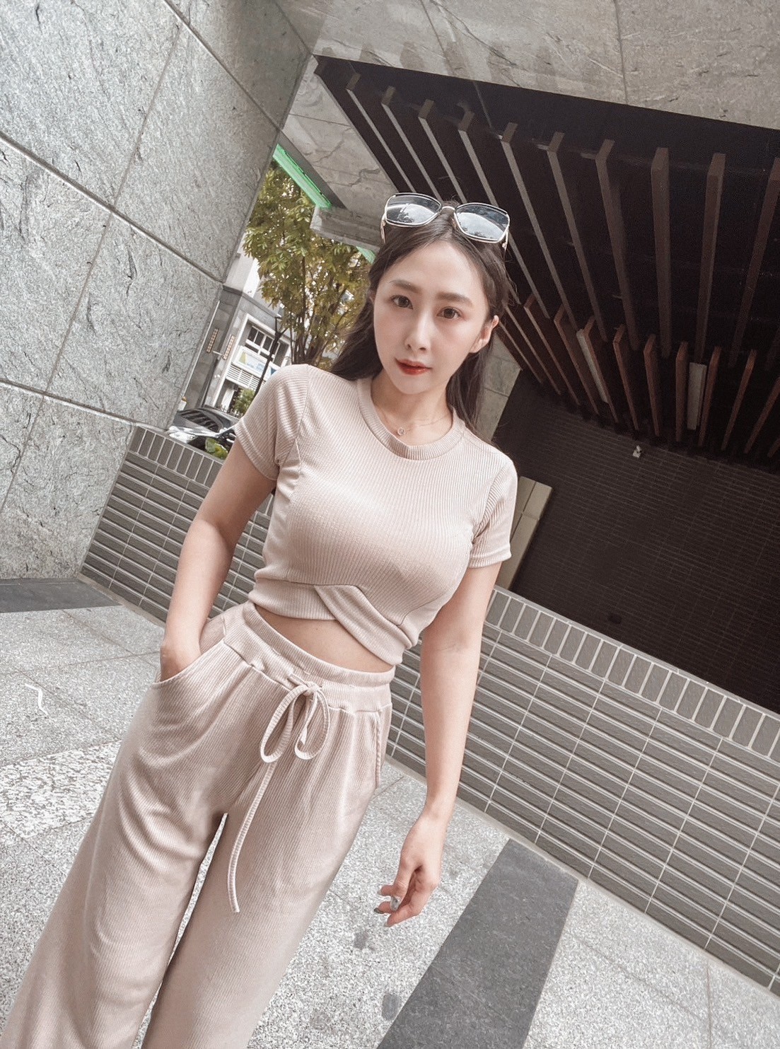 韓版經典同色系套裝 上衣交叉下擺更顯腰身 高腰鬆緊彈性長褲 輕鬆穿出女神比例 可拆式手掌厚杯 彈力好 尺寸可穿到小L